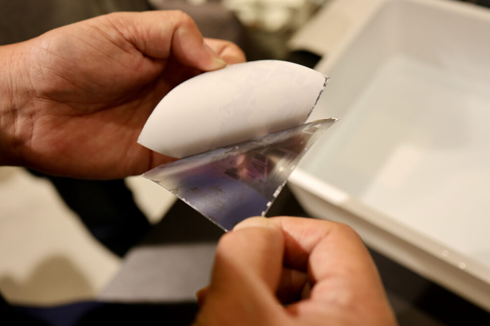 そして、この透明フィルムを水に浸ける。すると、乳剤部分がフワフワとフィルムから剥がれてしまう(エマルジョン(乳剤)がリフトするわけだ)。