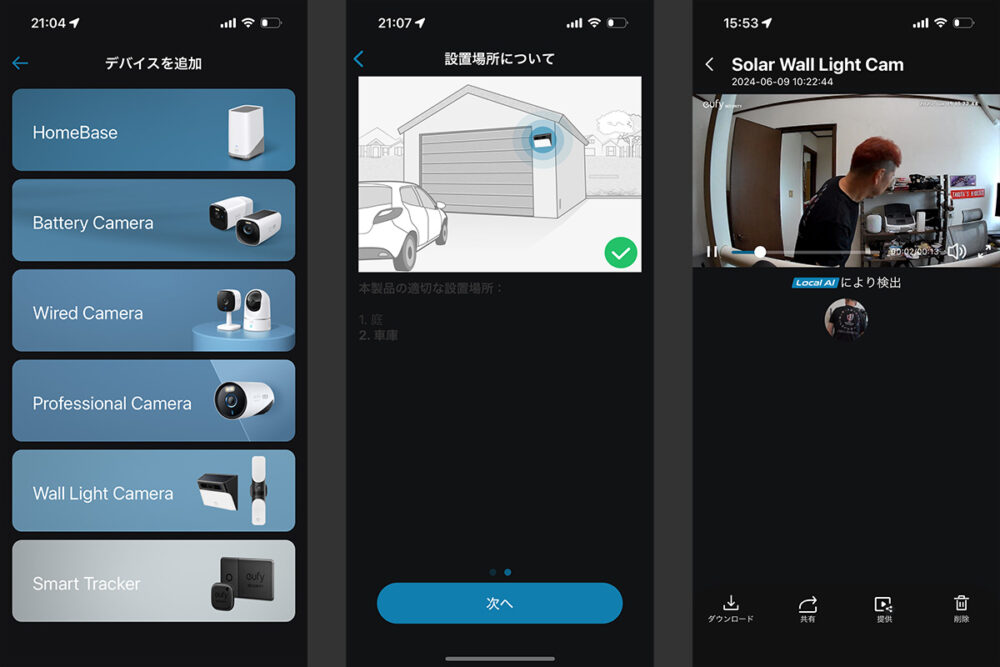 S120は、AIカメラが人を感知すると、最大300ルーメンの照明を点灯し、300万画素カメラで録画を開始する。スマホに通知を送り、スマホのeufyアプリから撮影された動画を確認することができる。