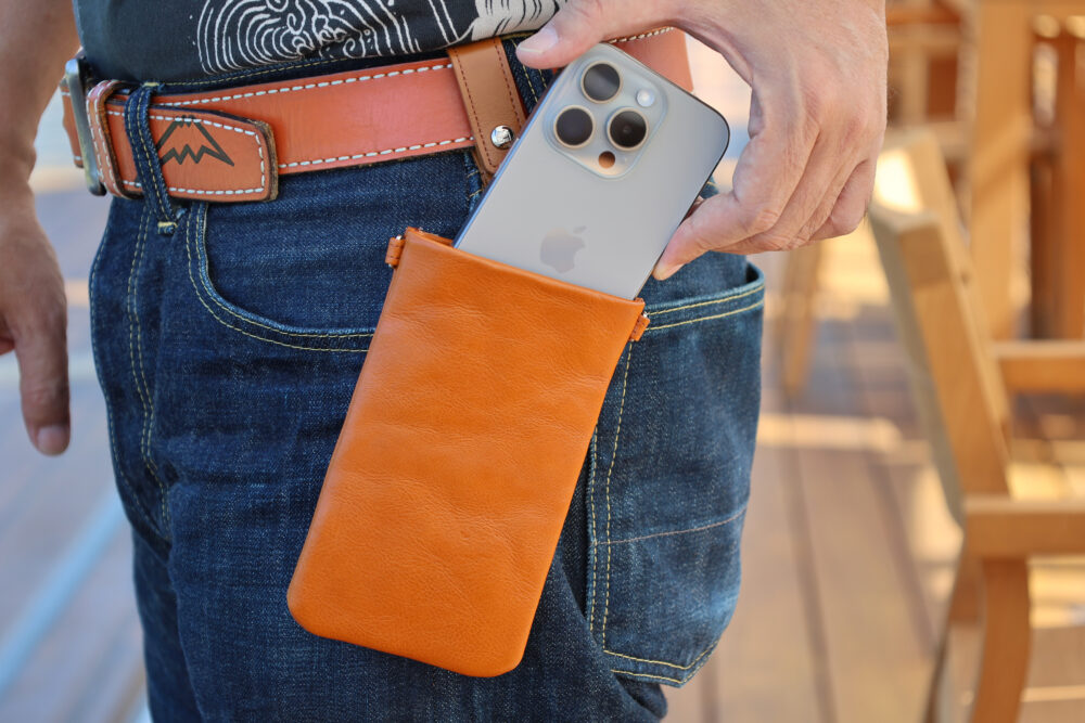 実は、iPhone 15 Proも入ったりはします。一般的なケースなら付けたままでも大丈夫。フタはないので、常時iPhoneを入れておくのはちょっと不安かもですが、いちおう、そういう使い方もできなくはない。