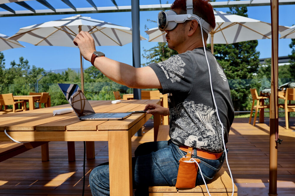 そして、↓こちらは、Apple Park Visitor Centerの2階で、取材記事を書いている時です。座っても身体の側面に流れてくれるので、具合が良いのです。ちなみに、この記事の写真のうちアウトドアのものはここで撮りました。