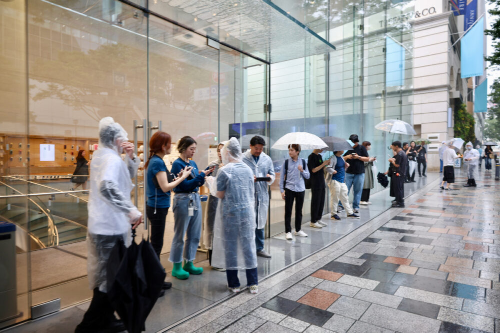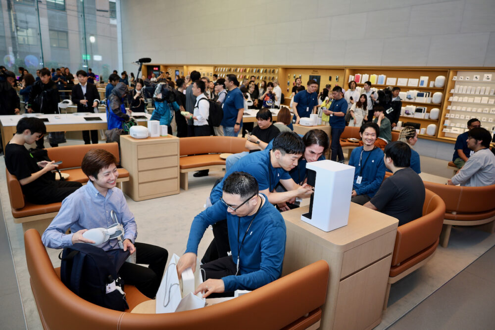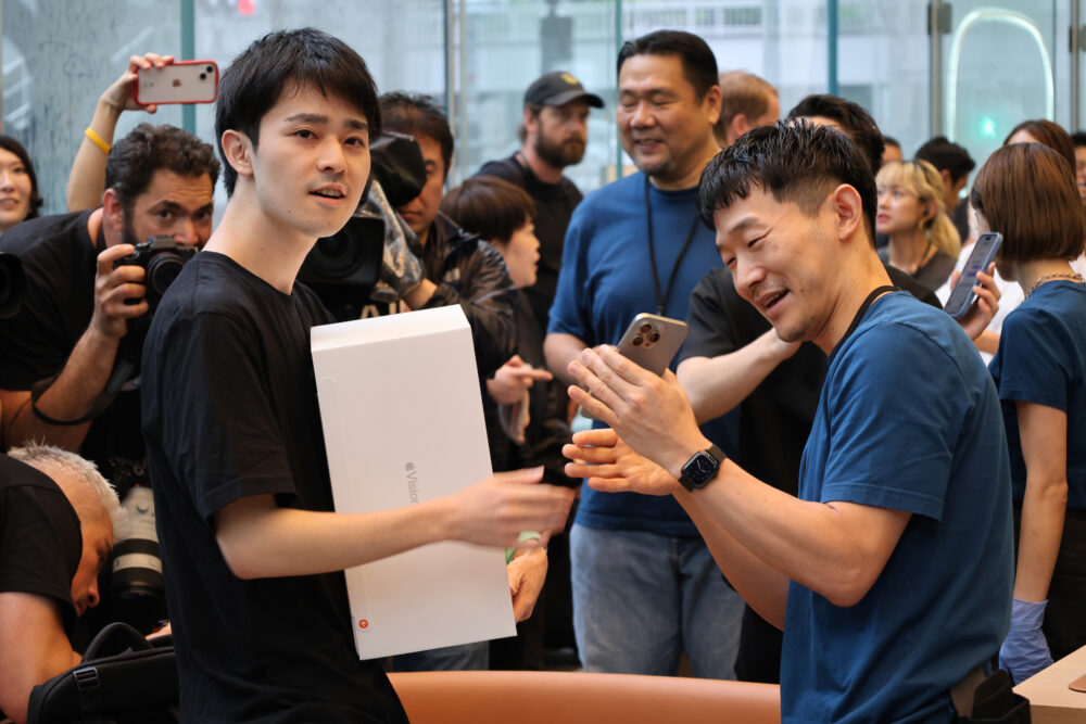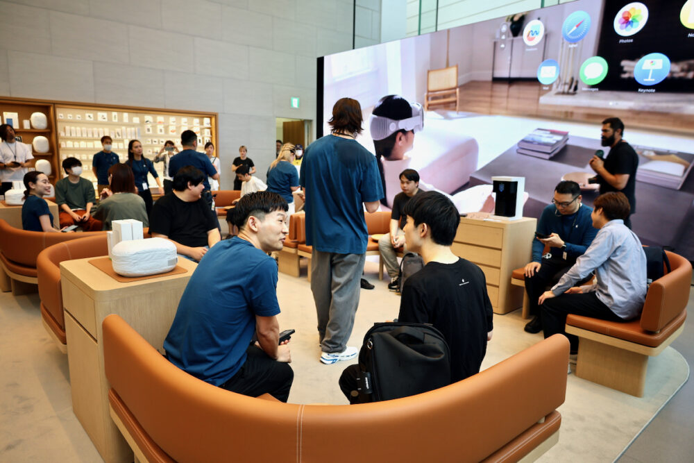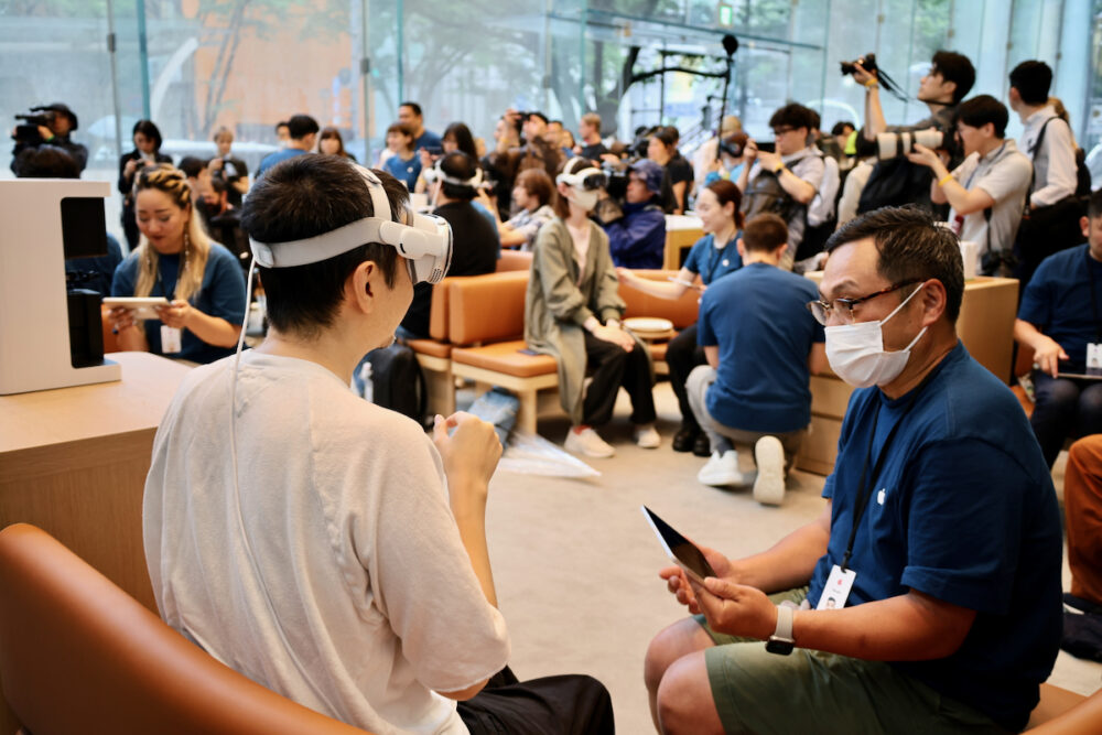 Vision Proは体験してから買うべき商品だし(実際、視力やさまざまな状況から、フィットしやすい人、しにくい人がいると思う)、体験には30分ぐらいの時間がかかる。というわけで、今日、朝イチに店頭に来た人は、朝早い回の予約をしていた12人のみということで、たいした混乱なく、ストアはオープンした。