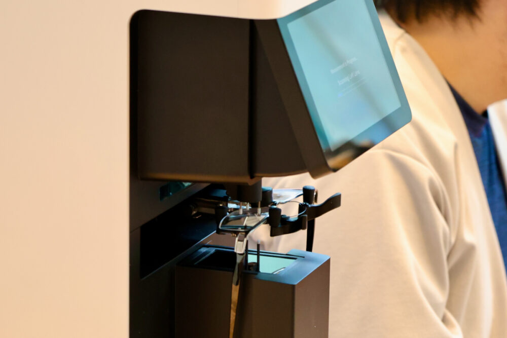 木製のキャビネットの上に置かれている白いデバイスは、使用中の眼鏡を乗せて度数を計測するデバイスらしい。