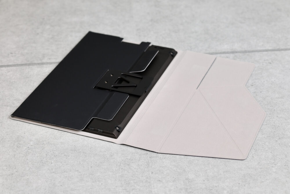 ご覧のように、製品を包んでバッグの中で守ることができると同様に、折り畳むことで製品のスタンドとなるようになっている。カバースタンドの上部に、本体のスタンドを差し込むことで、上下画面配置が実現するというわけだ。写真のようにMacだとすき間が空いてしまうが、14インチサイズのVAIOだと、当然ながらピッタリとフィットする。