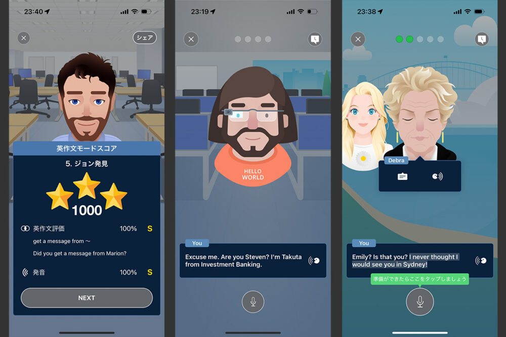 アプリのカリキュラムは1日20〜30分ぐらいで、ストーリーに沿って登場するキャラクターと会話するのが基本構造。キャラクターは合成音声で話し、こちらの発話は音声認識で判断される。この音声認識がけっこう良くできてきて、「あ、僕の発音が悪かったから通じなかったんだ」とか、「僕の発音は、英語圏の人にはこう聞き取られるのか」と思えるレベル。