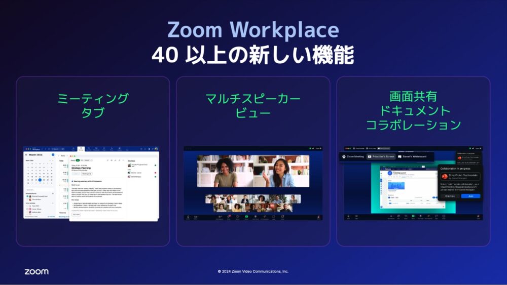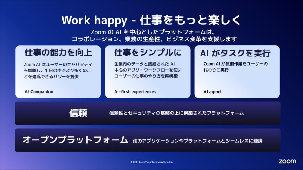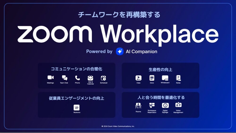 現在のZoomは単なる『ビデオ会議アプリ』ではなく、リアルにしても、オンラインにしても『ミーティングの予定を立てる』、『ミーティング行う』、『その結果をまとめる、供給する』と、いう前後の仕事も含めた総合アプリとしてビジネスを再構築する『Zoom Workplace』に進化しており、その高機能化にAI Companionを活用している。