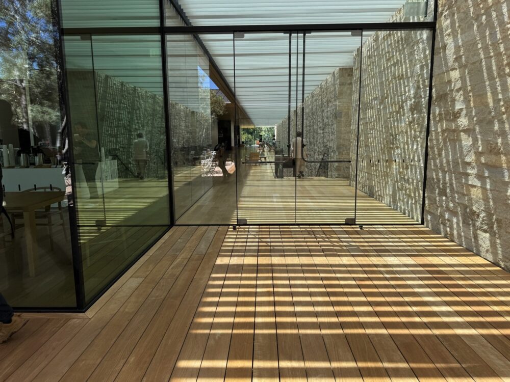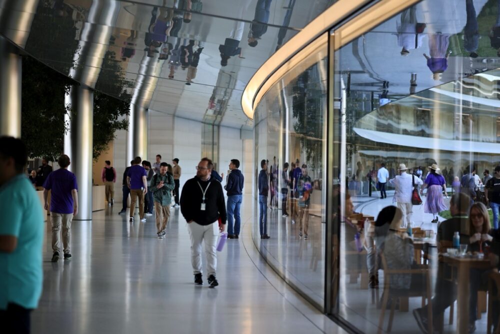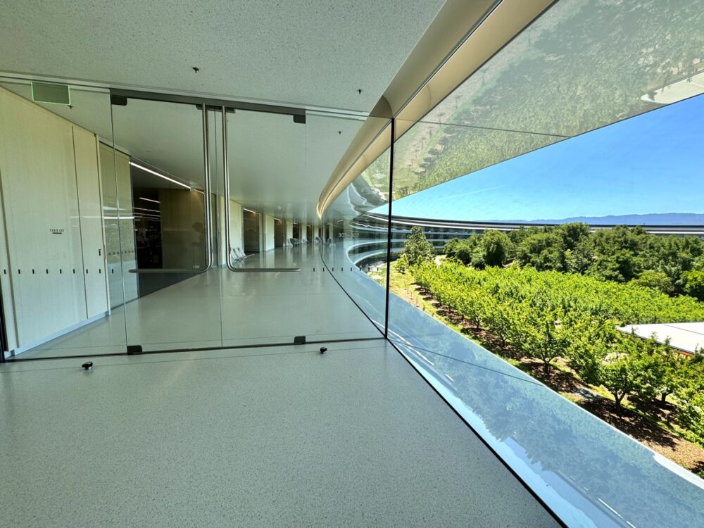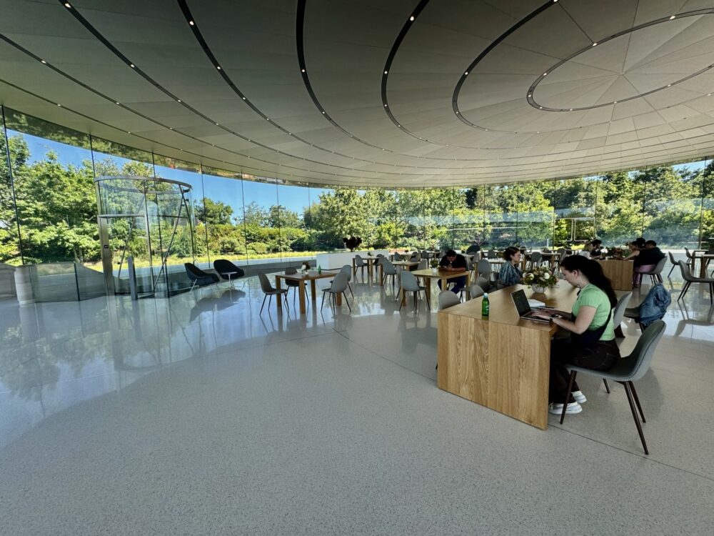 7年前から中断期間を除いて毎年iPhoneの発表会を取材しに行っているSteve Jobs Theaterの1階。カーボンファイバー製の屋根が、ガラスの壁で支えられており、柱は無い。iPhoneの発表会のときには、ここは待合室になるのだが、最近のWWDCでは発表された新製品がここに展示されることもある。今回のWWDCはApple Intelligenceの発表が中心で、新製品はなかったので、このフロアは閑散としていた。