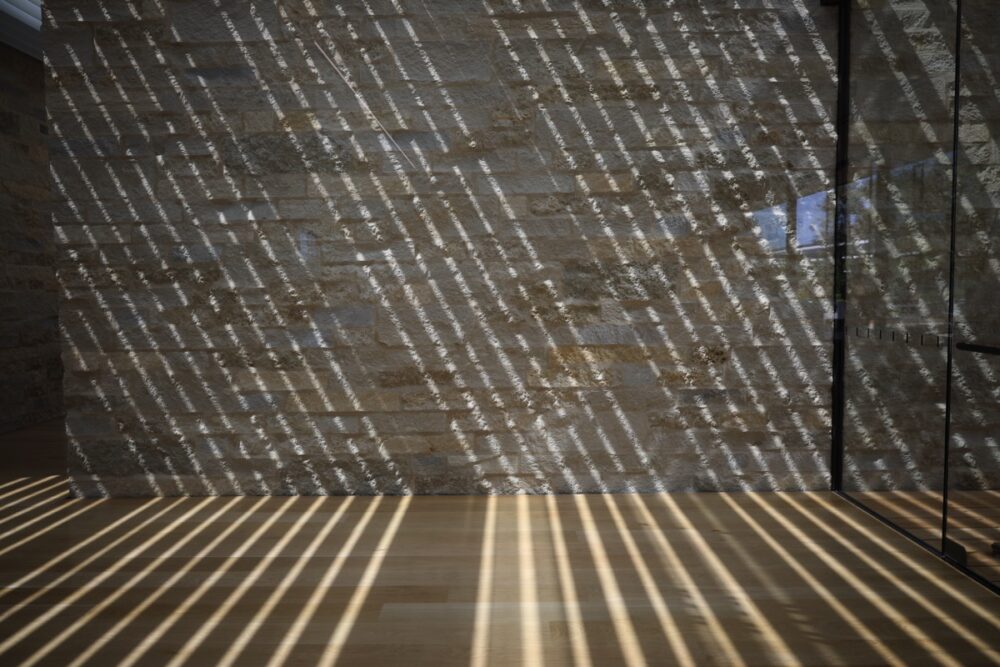 特徴的なのはご覧の砂岩のような素材でできた壁とガラス、そして外光を取り入れるように作られたルーバー付きのルーフが素敵。