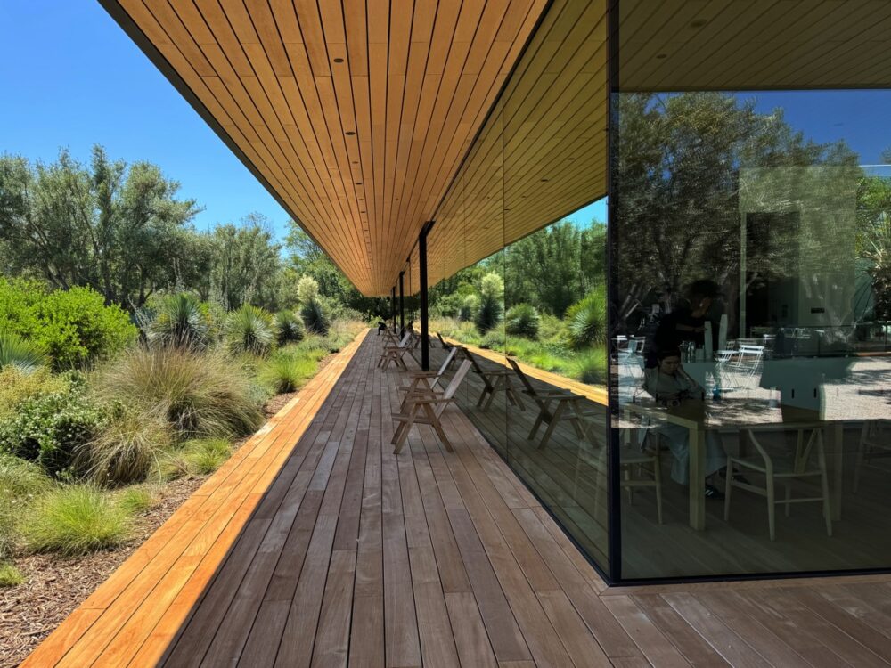 これまで撮影NGだったのに、今回規制されなかった場所がこちら、Apple Park Fitness Center。Apple Parkの敷地の北西角にある。もちろん外からその存在は見えないが、ご覧のようにとても素敵な場所なのだ。