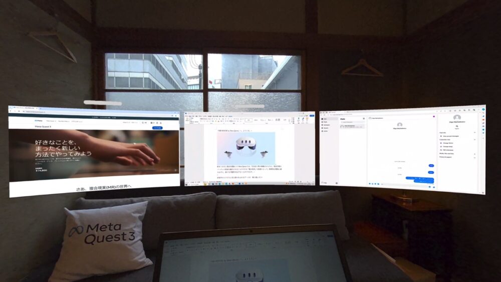 2階へ移動してこんどは、パソコンの外部ディスプレイとしての利用。Vision Proも最大の用途はこれだから、Meta Quest 3でどのぐらい使えるのかは興味深い。
