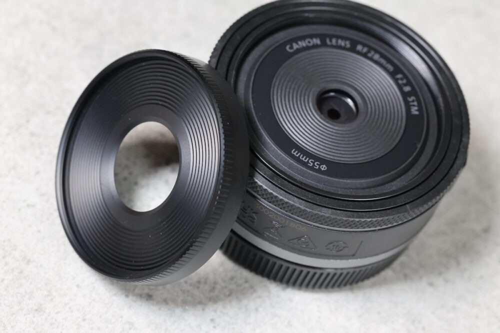 アクセサリーとしてレンズフードEW-55という製品が用意されており、これを使えば画角外からの不要な光を遮れるほか、レンズキャップをせずにカメラバッグに収納してもレンズへの汚れの付着などをあるていど抑制できる。