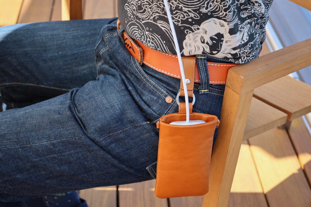素材はキップレザーで、少しムラ感のあるキャメルカラーに染めてある。落しがちなVision Proをベルトに固定できるし、ストラップで下げることもできる。