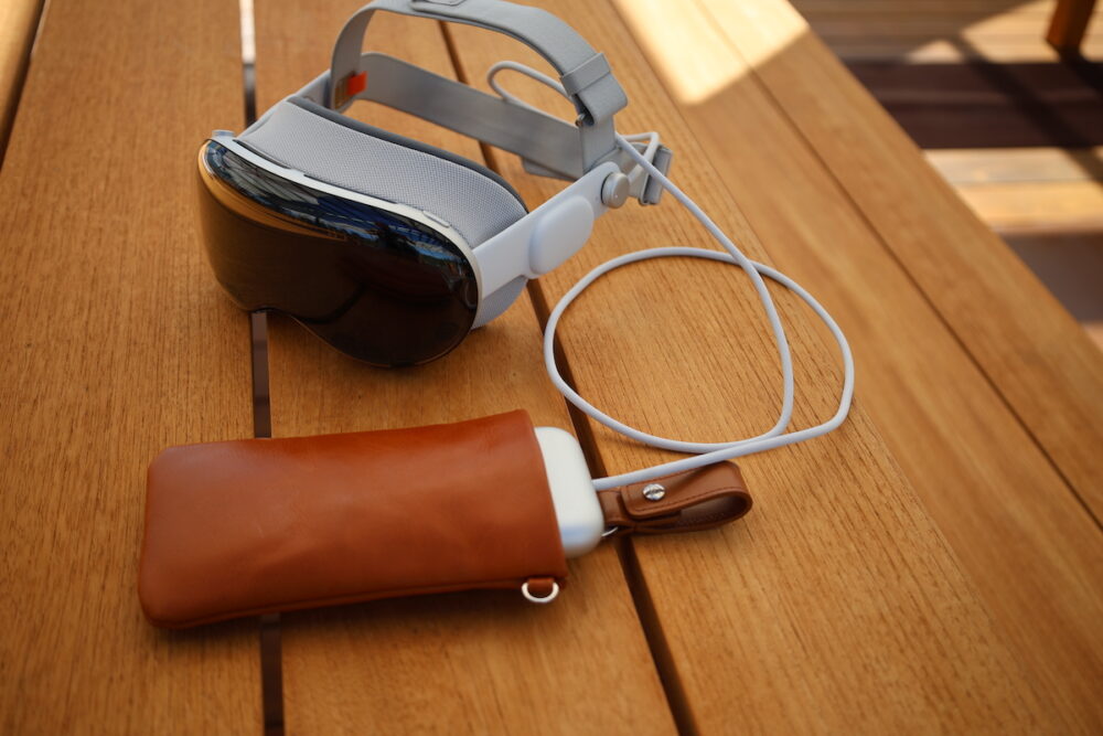 アルミとガラスでできたテッキーなVision Proと、キャメルカラーのレザーが妙にフィットする。実はApple Storeのソファなどを意識して色を選んだ。