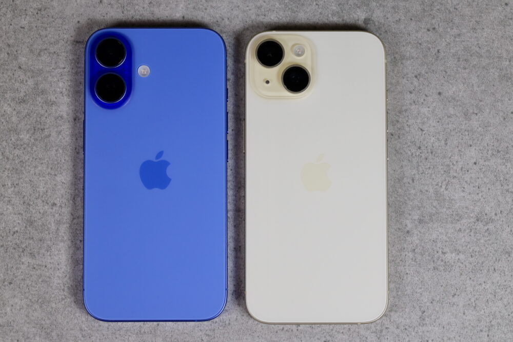 iPhone 15と、iPhone 16の実物を見比べて、一番に気が付くのはカメラが縦に並んで大きくなったことだろう。