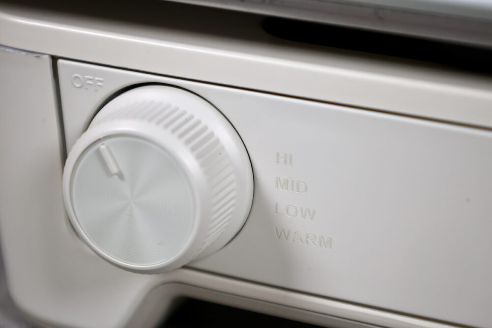 温度調整ダイヤルによって、温度は4段階に調整できる。一番スタンダードなのがMID(190℃)で、これはどんな料理でも使いやすい。焦げやすい食材に適しているのはLOW(150℃)。HI(250℃)は最後のひと加熱、高温で焦げ目をつけたい時に使う。WARM(100℃)は出来上がった料理の温度維持に使える。