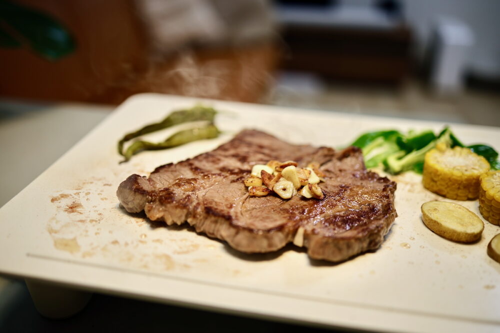 ステーキにはいろいろ焼き方があると思うが、今回はHI(250℃)で、表面をカリッと焼き上げるとともに、内部にも少し熱を通した……つもりだったが、ちょっと熱を通し過ぎた。もうちょっと中はレアな方がいいのだが。このあたりは研究の余地あり。