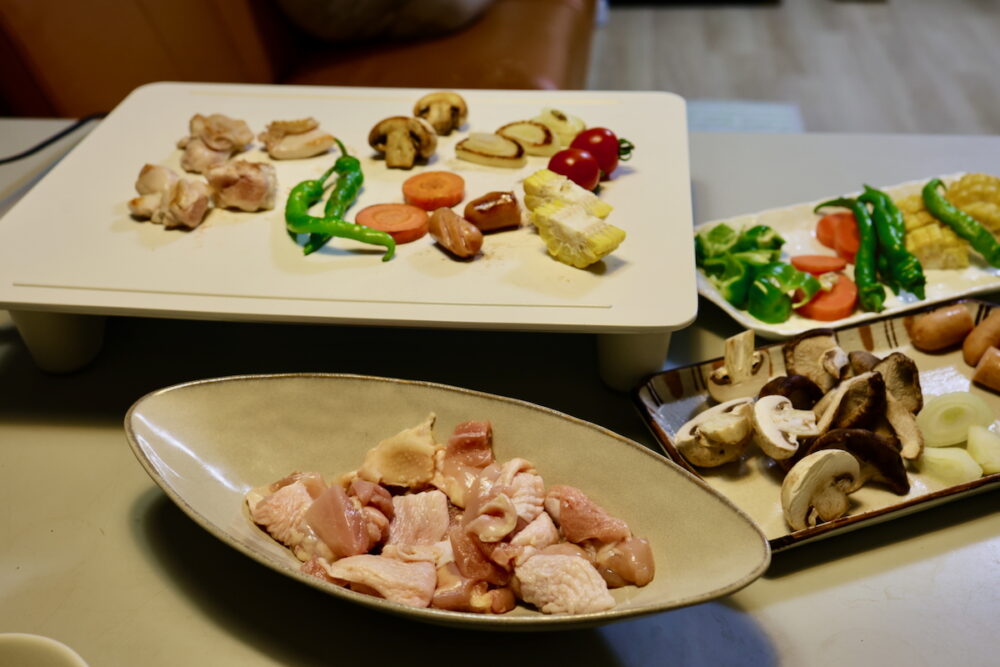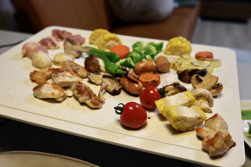 食卓の上にあるMAGIC GRILLにそれぞれが好きに食材を載せ、好きに食べるというのはとても楽しい。焼いてからソースや、塩コショウ、柚子胡椒など好みの調味料を加えて食べるのも楽しい。