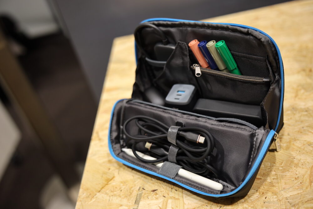 意外と現場で注目されていたのが、このAnker Smart Pouch。コクヨとの共同開発で、コクヨのHaco・bisがベースになっているのだが、文具用のHaco・bisをAnkerがガジェット用に魔改造している。