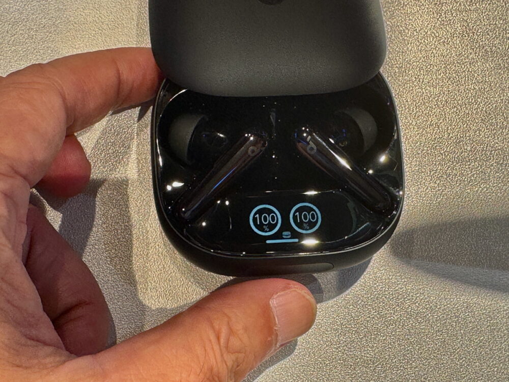 中でもユニークなのが、ケースにディスプレイと、タッチバーを装備していること。これにより、アプリを立ち上げなくてもノイズキャンセリング⇔外音取り込みの強度を調整できるし、バッテリー残量なども表示できる。これは先進的なアイデアだ。