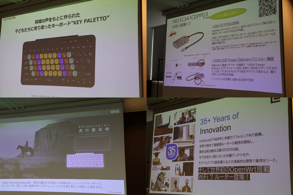 プレゼンテーションを行なった出展周辺機器メーカーは、フォーカルポイント、トリニティ、Linksys、エレコム、PFU、StarTech.com、プロ機材ドットコム、鹿島建設/OPSODIS、NeoRealXなど。