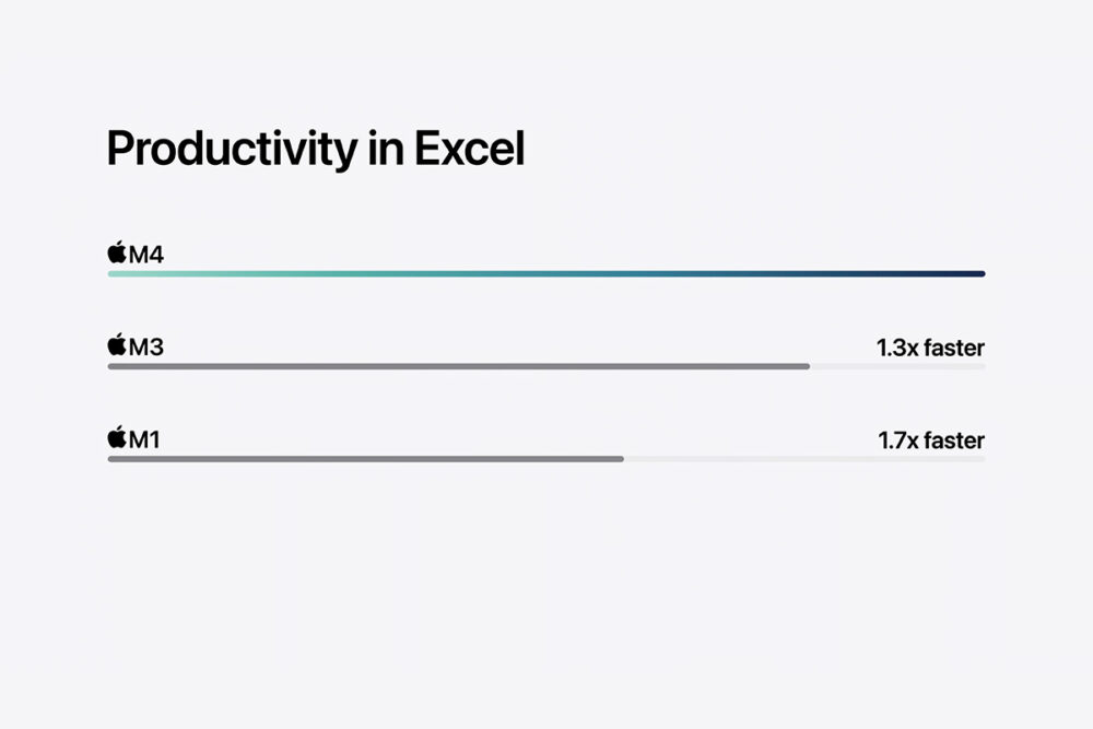 チップセットが更新されたことで、処理能力は大幅に更新されており、Excelでの処理能力はM1より1.7倍、M3より1.3倍高速だとされている。
