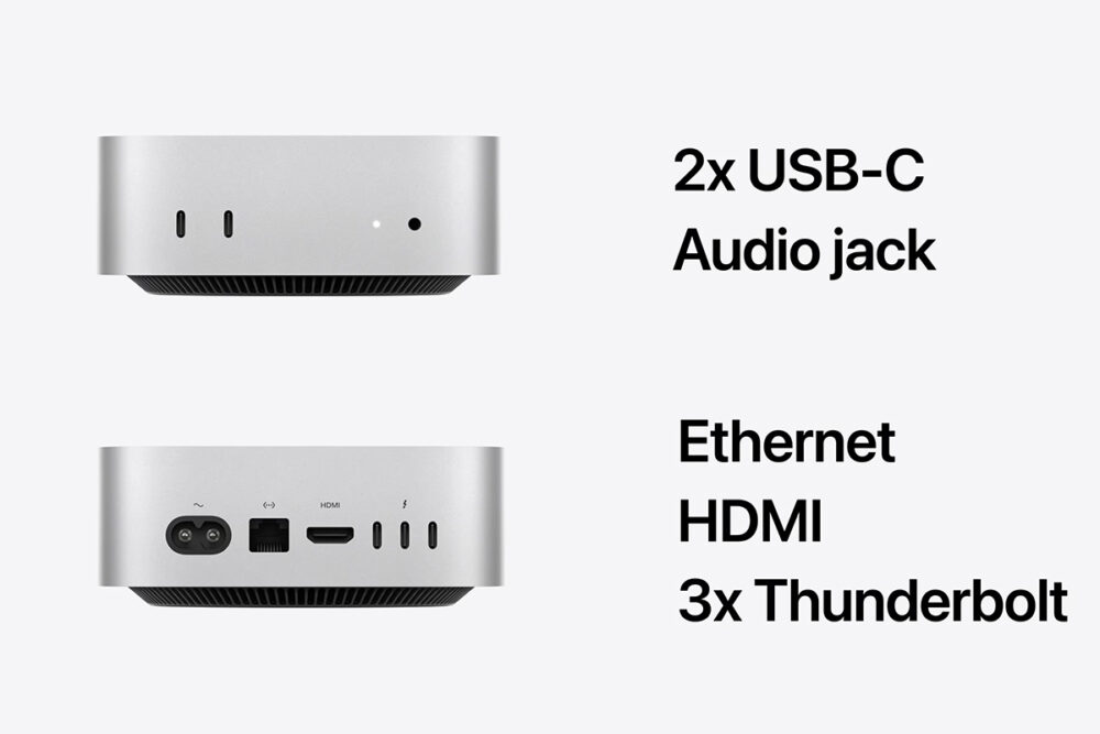 従来モデルと違って、前側にもポートが設けられており、前側にUSB-C×2とオーディオジャック、後ろ側にThunderbolt×3と、ギガビットEthernet(10Gb Ethernetに変更可能)とHDMIとなっている。背面のThunderboltポートは、M4搭載機はThunderbolt 4(最大40Gb/s)だが、M4 Pro搭載機はMacで初めてのThunderbolt 5(最大120Gb/s)搭載。大容量ストレージを、内蔵ストレージと変わらない速度で操れるはずだ。