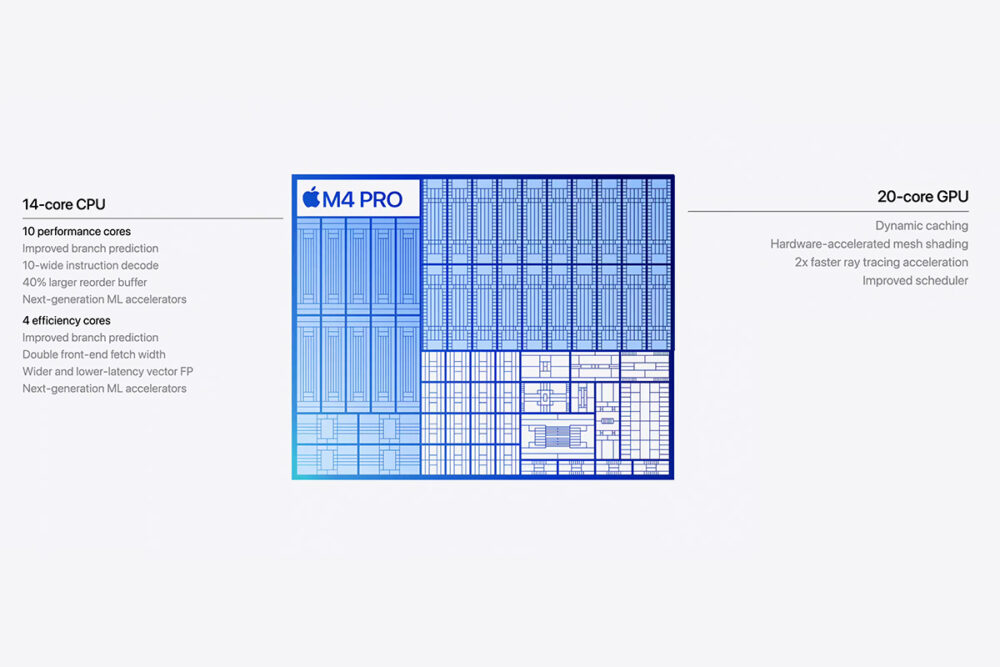M4 Proの搭載機の最廉価モデルは8つの高性能CPUコアと、4つの高効率CPUコア(燃費重視のM4とだいぶ設定が違う)、16のGPUコア、16のNeural Engineを持っており、メモリは24GB、ストレージは512GBからの設定。価格は21万8800円。