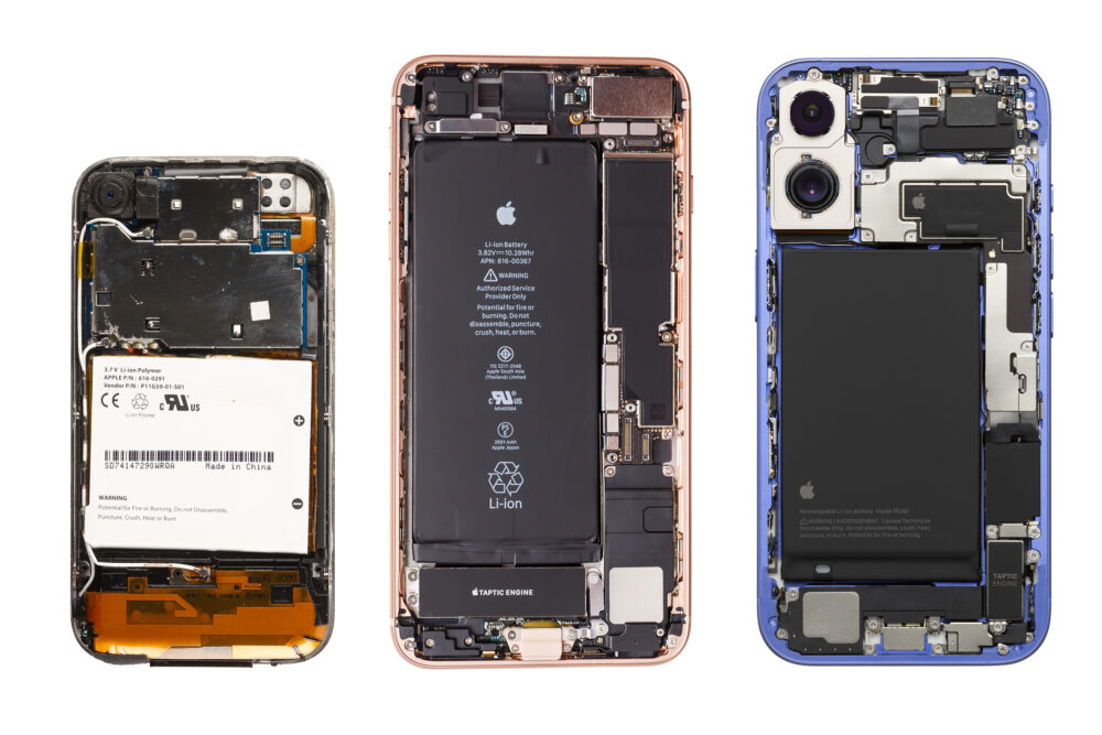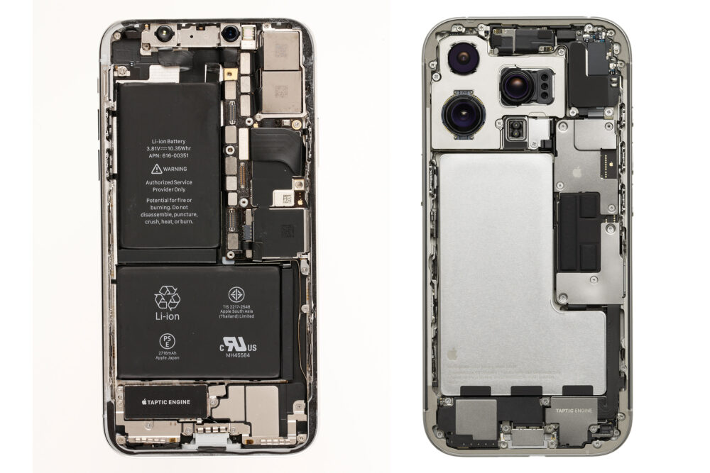 筆者が一番気になっていたのは、iPhoneのスタンダードシリーズと、Proシリーズの決定的な違いだ。いろいろな要素があるが、バッテリーの形状とセル数が気になる。iPhone 8から始まるスタンダードシリーズは大きな1セルだが、iPhone Xから始まるProシリーズは2セルをL字型に組み合わせて使ってる。