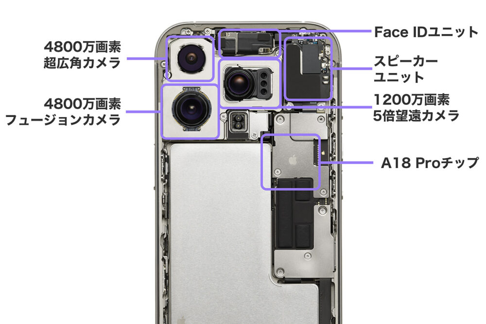 そのスぺースは基盤の縮小によって作られている。iPhoneの歴史上、基盤に搭載されていたさまざまな部品は、どんどんAシリーズチップの中に組み込まれていっており、そのことが他のパーツを組み込むためのスペースを作り出している。iPhone 16シリーズに搭載されているA18/A18 Proは、非常に多くの機能を盛り込みつつ極めてコンパクトに収まっている。こうして、他の機能にスペースを割くことができるようになっているのである。