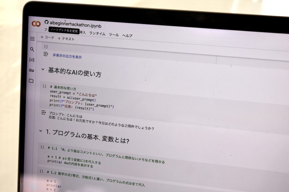 基本的なAIの使い方として、Pythonのプログラム内でのプロンプトの入力の仕方が説明され、次にPythonが基本中の基本から説明される。なにしろ、Colabに書いてるから、実行ボタンを押すだけで使える。自分で一部を書き換えるのも簡単。まったく、昔、BASICマガジンに掲載されてるプログラムをポチポチ入力して、どこかが間違えていて動かなかった……という経験はなんだったんだ! と思わざるを得ないスピード感だ。