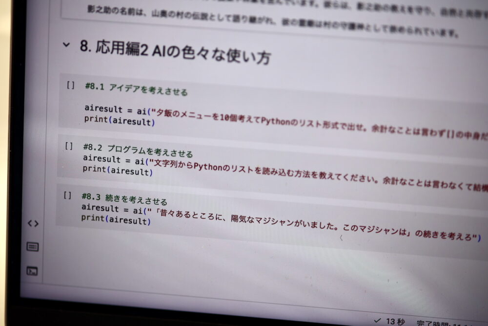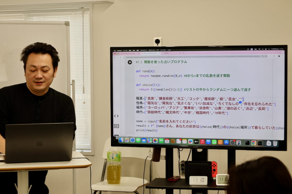 そうやって、サンプルプログラムを使いながら、変数、リスト、制御構造、ユーザーからの入力を受け付ける、ランダム(乱数)を使う、関数を作る、関数を使って、インチキな占いを作る、AIの使い方……というところまで1時間。いや、前半にヨタ話(もちろん、緊張をほぐすための清水さん流の配慮だ)があったから、実際の時間は30分ぐらいだったように思う。