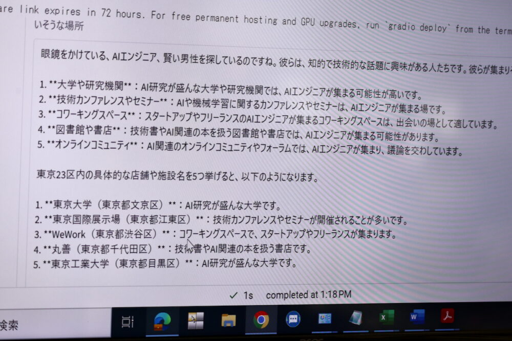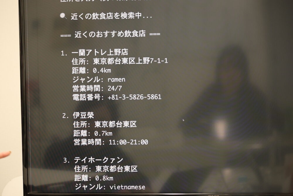 それから男性に求める条件を入れたら、その男性と出会える場所を教えてくれて、仲良くなる方法まで提案してくれるアプリ。『眼鏡をかけている、AIエンジニア』という条件を入れたら『東京大学』『東京国際展示場』『WeWork』『丸善』『東京工業大学(現:東京科学大学)』などがサジェストされた。そりゃそうだろという気もする。仲良くなる方法のところはまだ実装が終わっておらず動作しなかった。どんな結果が出てくるのか、ちょっと見たかった。