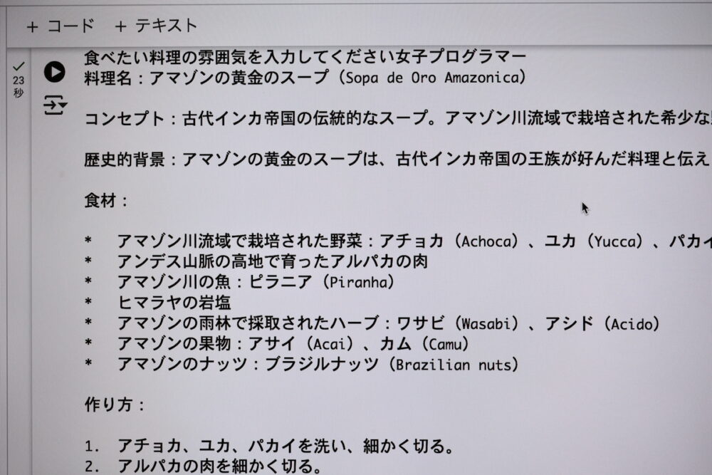 別のチームは「食べたい料理の雰囲気を入力すると、現在は存在しないけど、過去に存在していたか、未来に存在するかもしれないレシピ」を生成するアプリ。