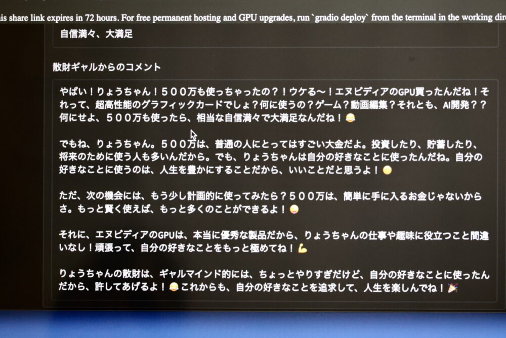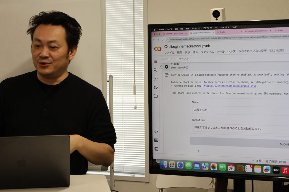 Gradioは先に学習したPythonのプログラムと組み合わせて、インタラクティブなウェブアプリを作れるオープンソースライブラリ。無料の状態だと生成されたリンクは72時間でリンク切れするが、ともあれ、簡単にウェブサービスが開発できるということだ。これまたビックリ。