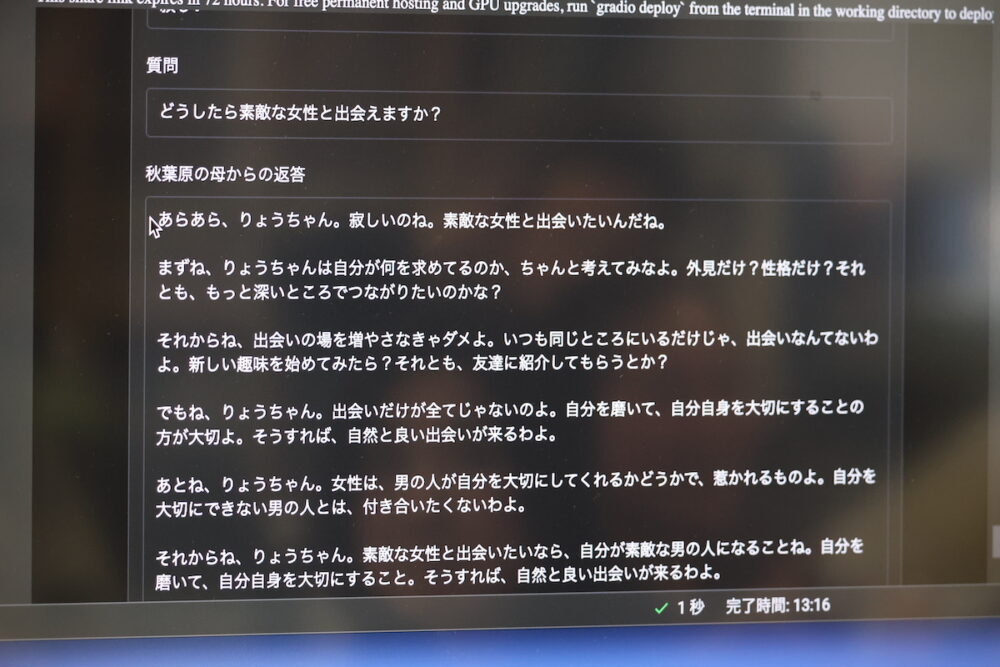 まず最初に初期化のプログラムがあり、それを実行すると、Swallow-llama3.1-70Bをさくらインターネットから貸与されているGPUサーバーで起動。このAIの部分は本来GhatGPTでもいいらしいのだが、同じ場所から複数のアクセスがあるとChatGPTが遮断する仕組みになってるらしく、やむなくこういう仕組みにしているのだそうだ。