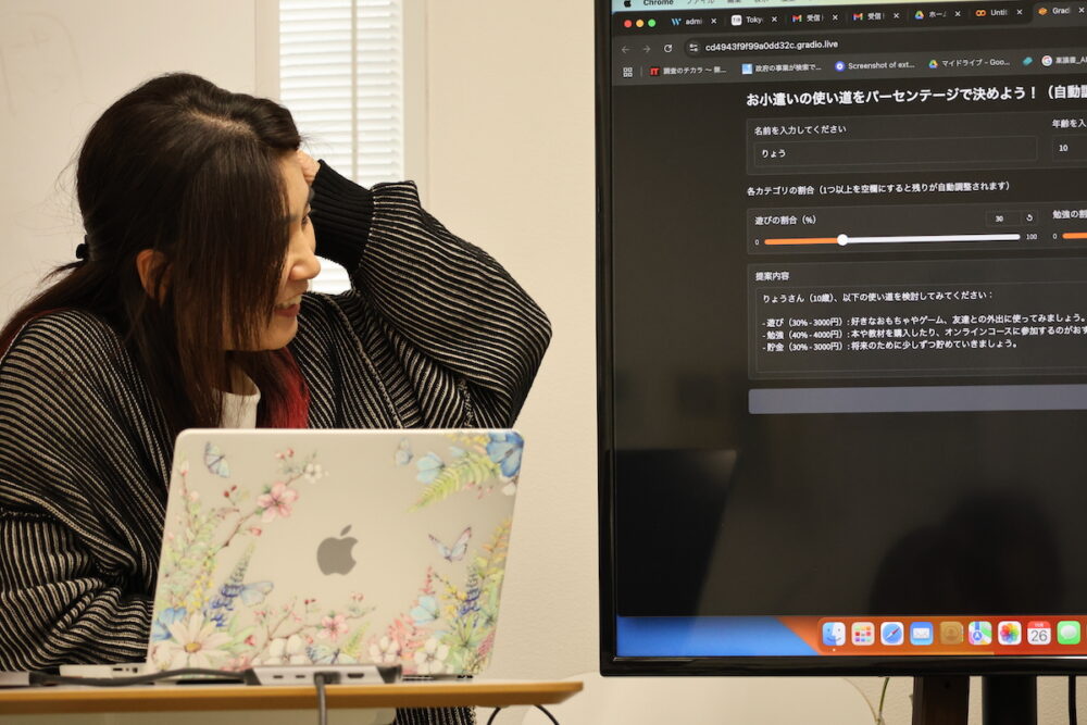 プログラミングを始める前のネタ出しの段階から、ChatGPTが活躍する。「食をテーマにした簡単なアプリを10個考えて!」と指示して出てくるアイデアを、3人で選んだり、ひねったり。企画出しのスピードも早い。