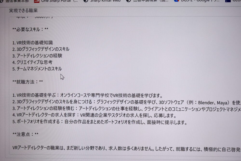 別のチームは、『欲しい年収と、カテゴリーを入れたら、どういうスキルを習得して、どうやって就職したらいいかを教えてくれるアプリ』を開発。これも、ちゃんと動いていて、どんなスキルを身に着けたらいいかのサジェストも正しい気がした。