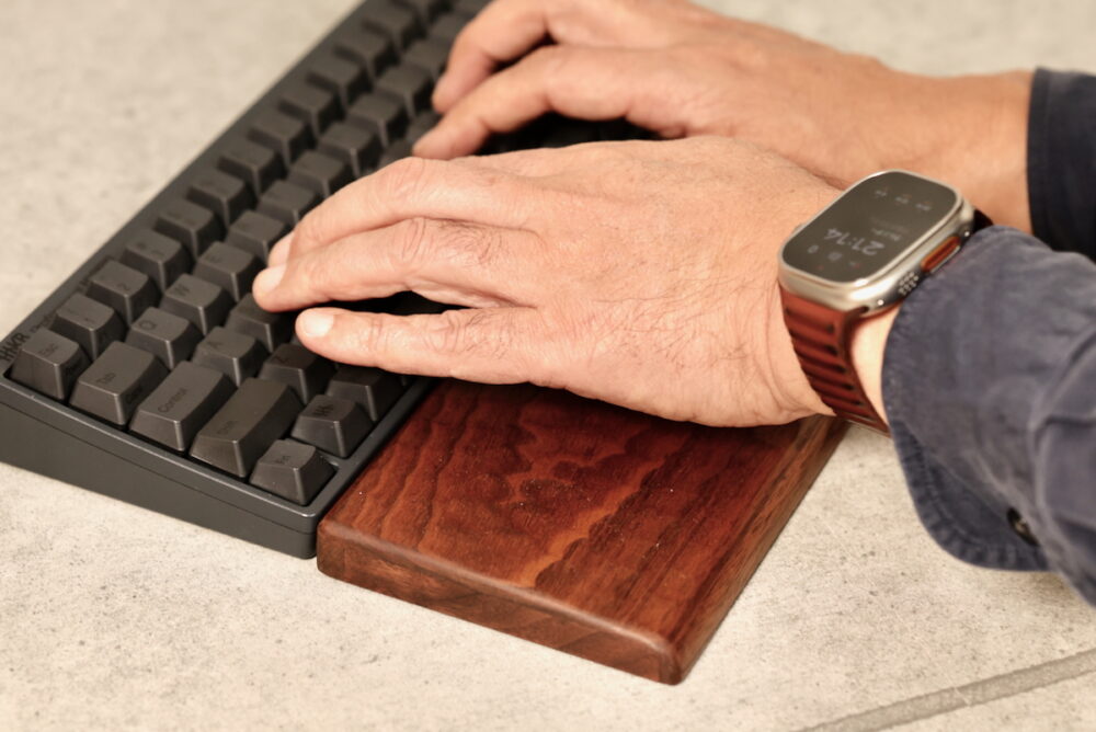 キーボードルーフとしても使えるし、パームレストとしても使えるという一挙両得の製品ながら、名栗には工芸品の風格さえ感じる魅力がある。