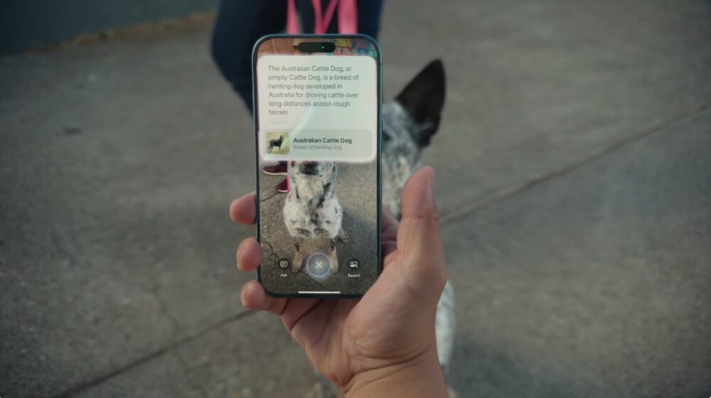 たとえば、道端で見かけた犬。Visual Intelligenceを立ち上げてカメラを向けると、その犬種などを解説してくれる。この持ち方、この位置ならカメラコントロールボタンは非常に使いやすい。おそらくこちらの用途の方が本来的な役割なのだ。つまり、AIを呼び出すCopilotボタンのようなものだ。