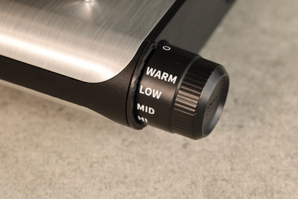 温度設定ダイヤルは、WARM約80度、LOW約130度、MID約180度、HI約220度の4段階に調整可能。火力はかなり強くて、一般的な焼き物はMIDで十分なぐらい。サイズから想像するより強力な能力がある。