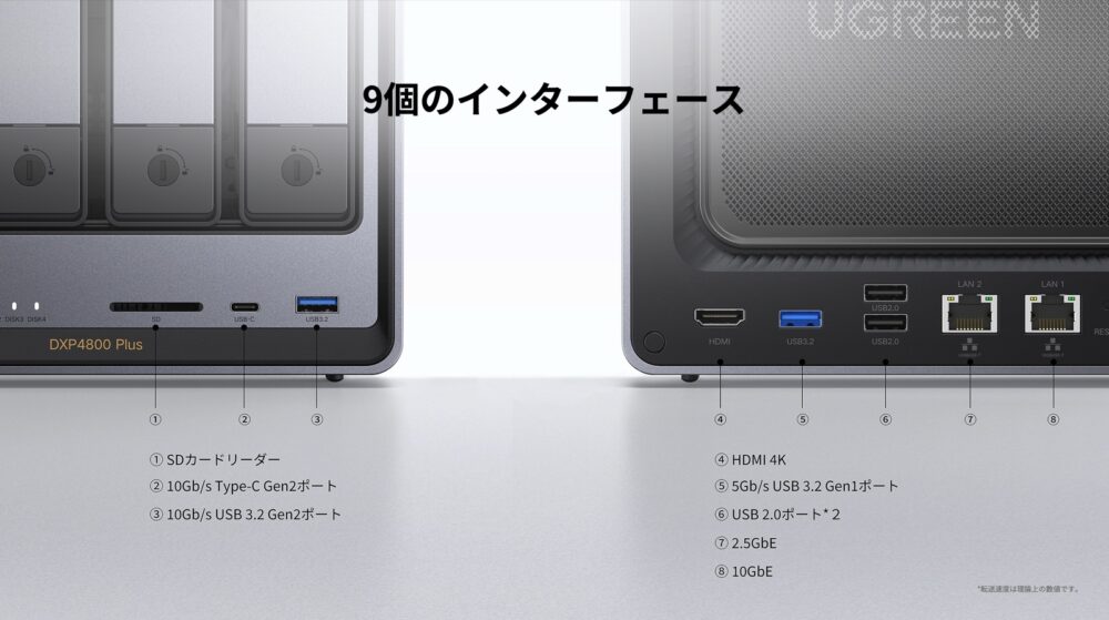 また、多彩なインターフェースを備えており、NASync自体からSDカードやSSDのデータを吸い出したりすることができる。