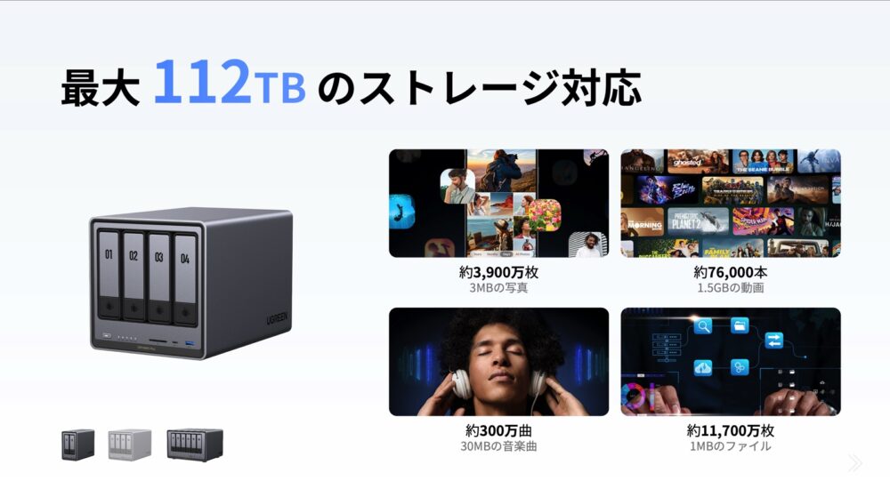 実際、4ベイだと最大で28TBのドライブを4台入れられるので112TBに対応。約3900万枚の写真、1.5GBの動画を約7万6000本、30MBの音楽を約300万曲、1MBのファイルであれば約1億1700万個を保存しておくことができる。