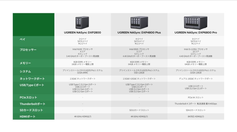 ドライブベイが2つのDXP2800と、4つのDXP4800 Plusと、6つのDXP6800 Proだ。