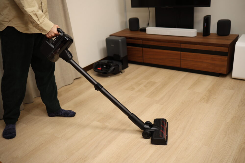 スティック掃除機にすると、ご覧のとおり。モデルの身長は175cmぐらいだが、長さは十分。腰をかがめなくてもいい。また吸引力も十分あるように思った。
