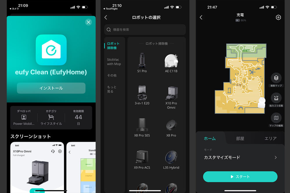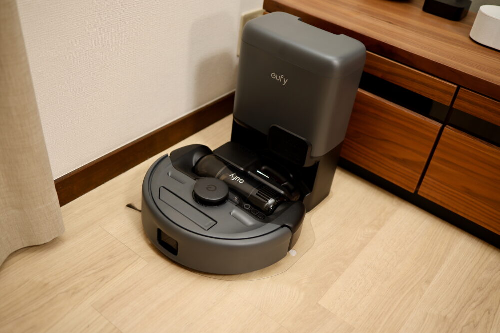 こうやって設置して充電開始。スマホにeufy Cleanというアプリをインストールして、それで自宅のWi-Fiに繋ぐことで、自動運転などが可能になる。
