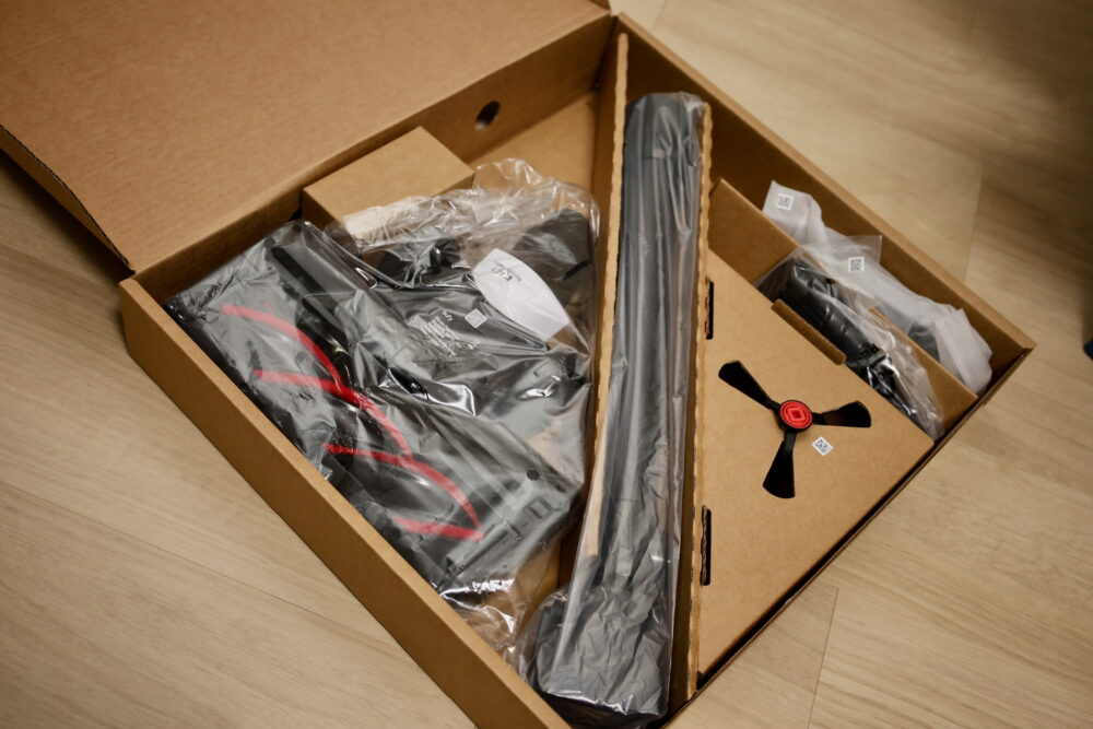 箱を開けると、こんな感じでパーツが入ってる。パッケージングは極端に複雑過ぎたり、ギリギリに入っていたりすることはない(梱包を破壊しないと出せないような複雑なパッケージだと、取材機を返却する時に困るのだ……)。