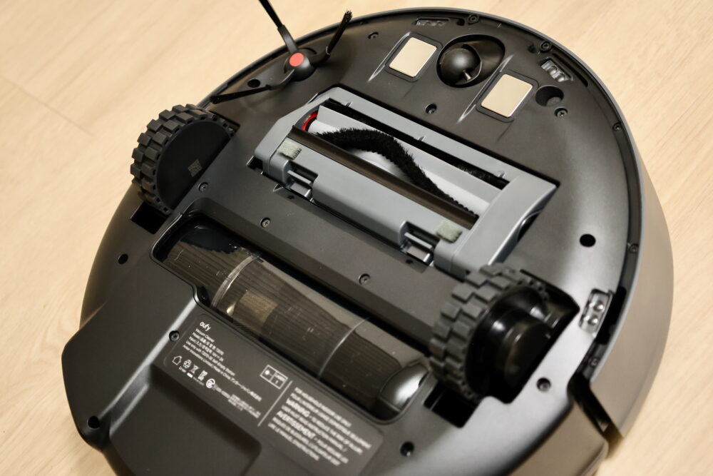 ロボット掃除機の裏側はこんな感じ。駆動輪は2つで、サスペンションが備わっていて、それなりの段差を乗り越えることができる。吸引部分にはローラーがあり、ダストを掻き込む構造だ。前輪の両脇についている四角い金属板は充電用の端子。左上にある3本のハケは回転してエッジ部分のダストを掻き出す。