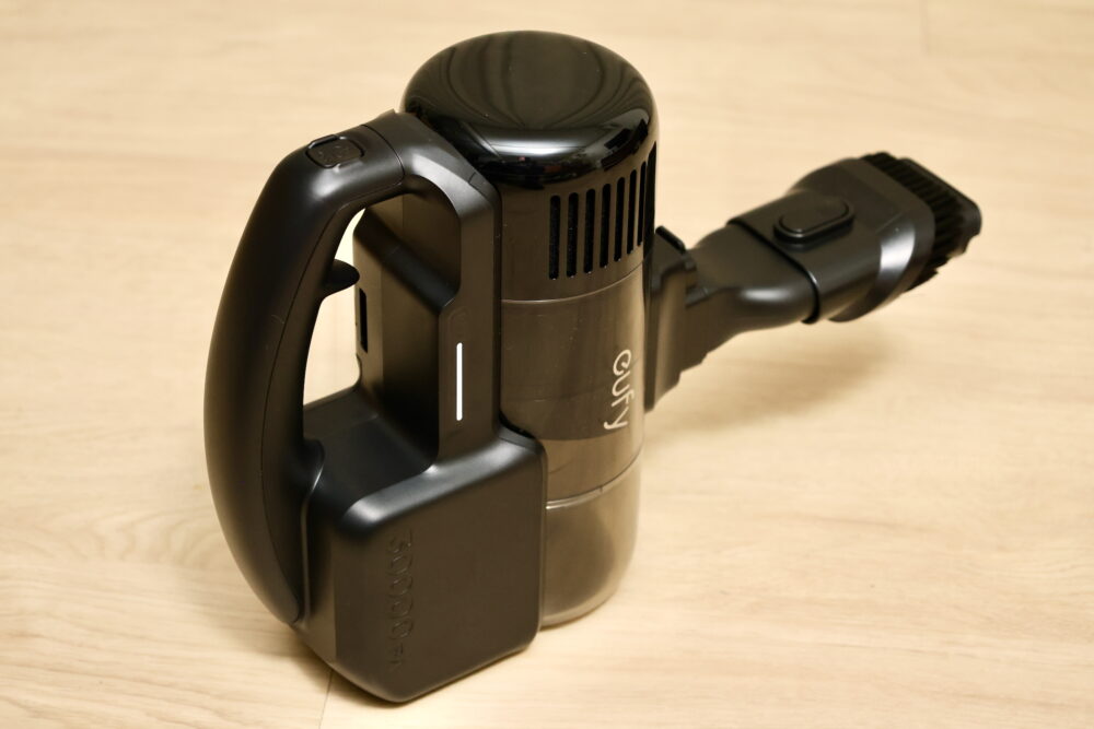 ハンディ掃除機で使うと、こんな感じ。上下方向に長いので、場所によっては入りにくいのがちょっと気になったが、吸引力は十分あるように感じた。