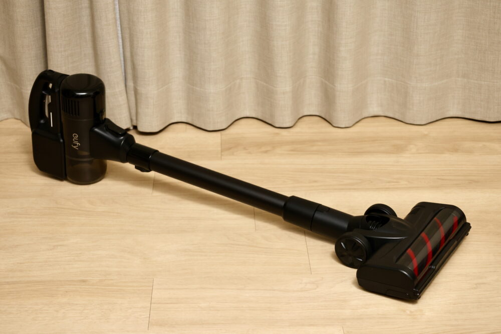 そして、スティック掃除機はこんな感じ(撮影のために短くしているが、以下の写真でわかるようにもう一段伸びる)。