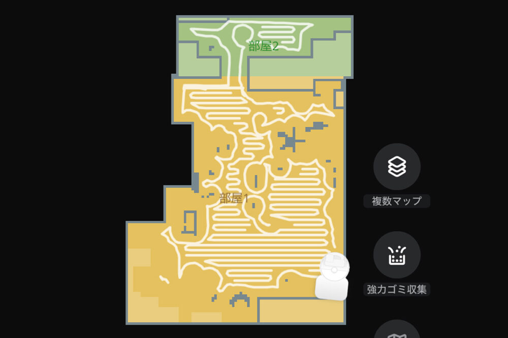 まずは、壁や障害物に沿って部屋を一周。外形に沿って回る。障害物なども着実に避ける。一応当たったりすることもあるが、突っかかってトラブることもなく、部屋の形状を理解したようだ。その後、中央の空いている空間を左右に往復するようにして埋めていく。