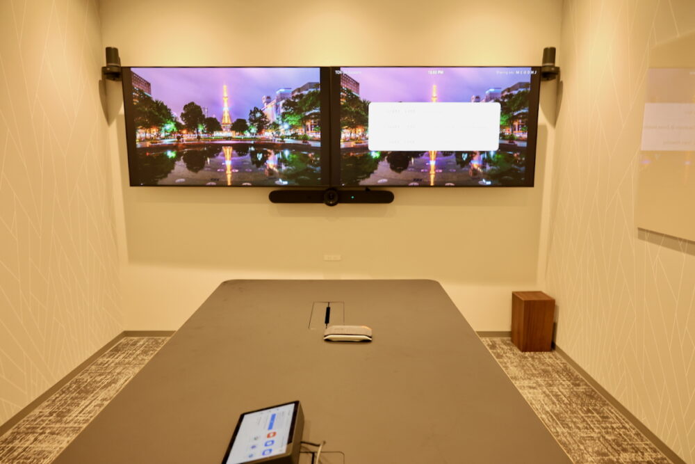 会議室(Zoom Rooms)は、サッポロ、キョウト、オオサカといった都市の名前がついており、それぞれ快適に複数人でのビデオ会議参加ができるように、連携するディスプレイ、カメラ、マイク、スピーカー、コントロールパネルが設置されている。